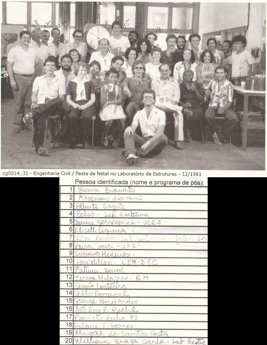 Fotografia do acervo do Departamento de Engenharia Civil (código cg0014_031) colocada para identificação no lançamento do site do Núcleo de Memória. Abaixo da foto, as identificações escritas pelas pessoas presentes: Joana Brandão, Koshrow Ghavami, Alberto Sayão, Celso (Lab. Geotecnia), Denise Gerscovich (UERJ), Eliseth Siqueira, Ivan Ramo, P.Couci (UFF), Luciano Medeiros, José Nelson (LEM/DEC), Fátima D., Tereza Milagres (RH), Sérgio Fontoura, Celso Romanel, George Bernardes, João Luis Roehe, Pedricto Rocha Filho, Erlane Soares, Magali dos Santos Costa, William Braga Carlos.