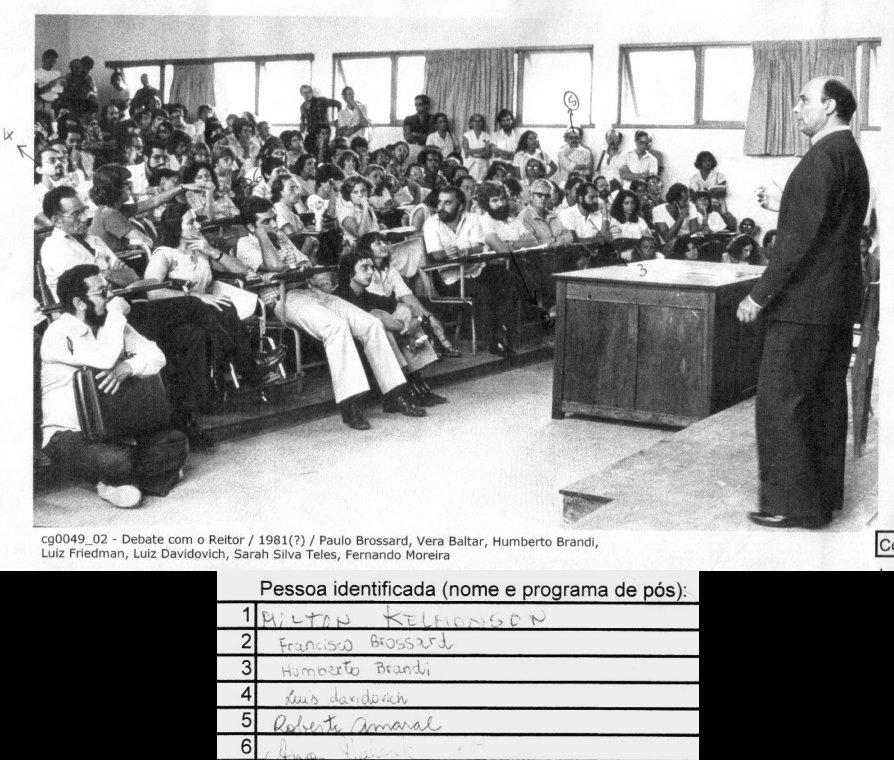 Fotografia (código cg0049_002) colocada para identificação no lançamento do site do Núcleo de Memória. Abaixo da foto, as identificações escritas pelas pessoas presentes. Identificados: Milton Kelmanson, Francisco Brossard, Vera Baltar, Humberto Brandi, Luiz Friedman, Luiz Davidovich, Sarah Silva Teles, Fernando Moreira, Humberto Brandi, Roberto Amaral, Ana Waleska Mendonça.