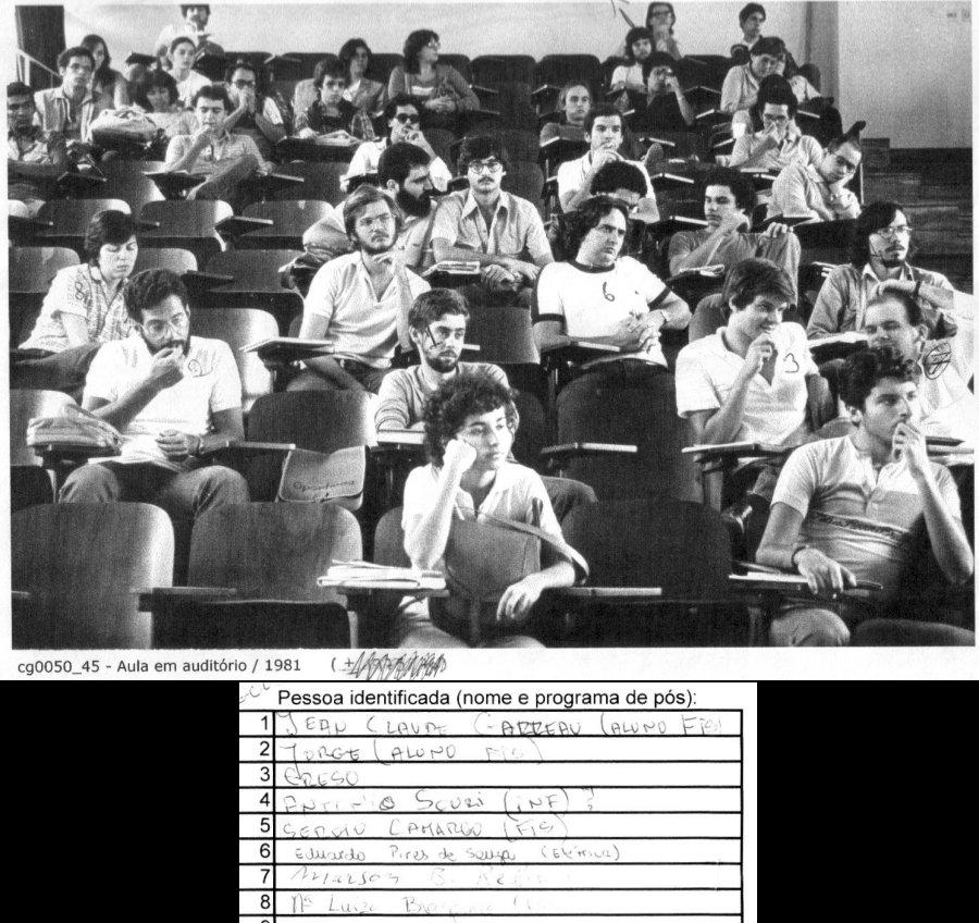 Fotografia (código cg0050_045) colocada para identificação no lançamento do site do Núcleo de Memória. Abaixo da foto, as identificações escritas pelas pessoas presentes. Identificados: Jean Claude Garreau (FIS), Jorge (FIS), Creso, Antoni Scuri (INF), Sérgio Camargo (FIS), Eduardo Pires de Souza (ELE), Marson B. Rebruzzi, Maria Luiza Bragança (QUI).