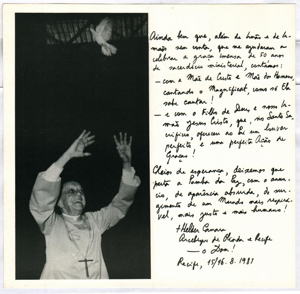 Página de folheto produzido pelo Instituto Dom Helder Camara (IDHeC) que reproduz uma fotografia do arcebispo junto a um bilhete manuscrito em formato fac-similar.