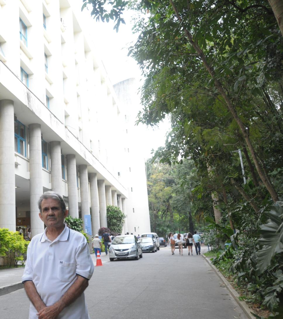 Antônio Albuquerque em frente ao Edifício Cardeal Leme. 2013. Antônio Albuquerque é fotógrafo do Núcleo de Memória desde 2008, e trabalha na PUC-Rio desde 1966.