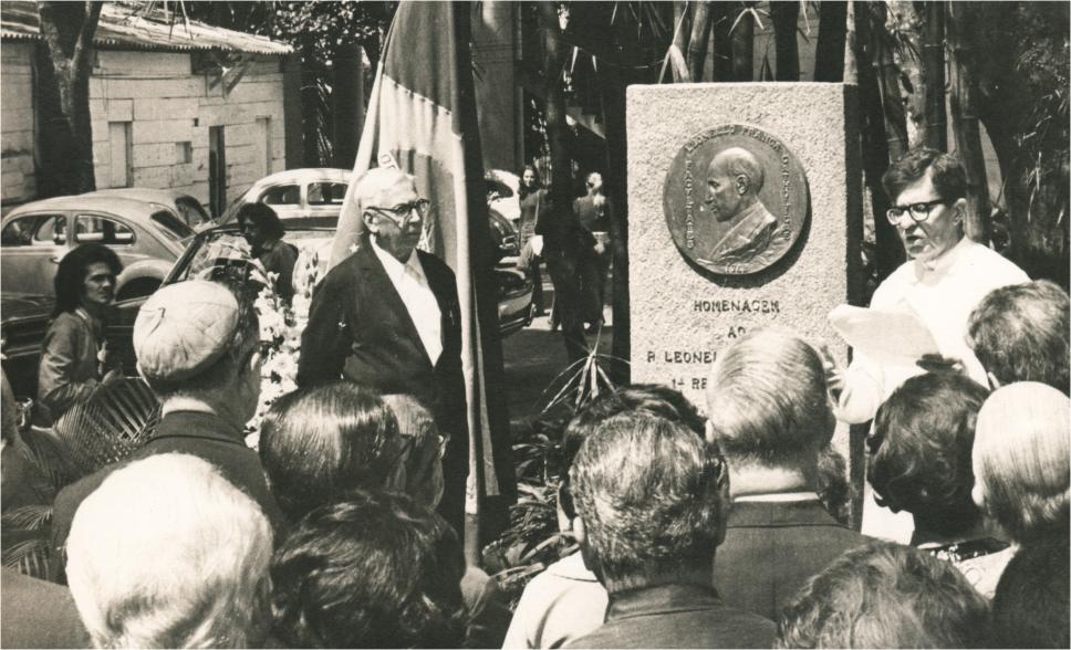 Inauguração do medalhão com o busto do Padre Leonel Franca S.J. na PUC-Rio. O fotógrafo Antônio Albuquerque aparece do lado esquerdo, em ação. Ao centro, o irmão do Pe. Franca, Pe. Leovegildo Franca, e, à direita, o Padre Leme Lopes S.J..