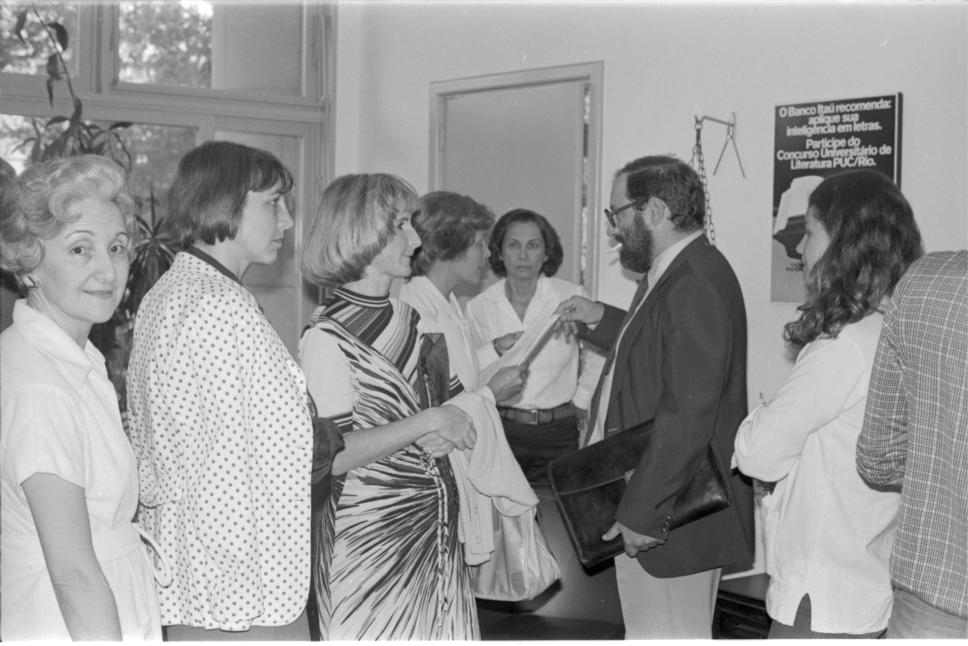 Visita de Umberto Eco à PUC-Rio. Imagem produzida no Departamento de Letras. No canto esquerdo, a Profa. Cleonice Berardinelli (LET). 1979.