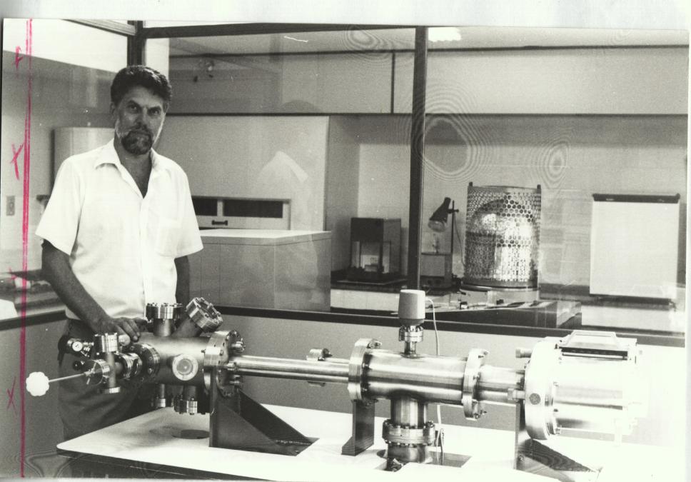 Professor Ênio Frota ao lado do espectrômetro de massa.