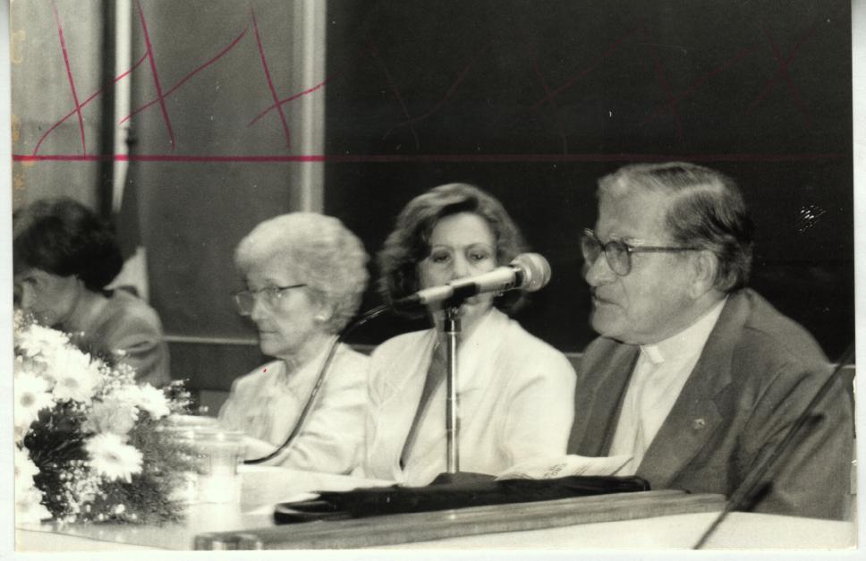 Da esq. para dir.: n.i., profa. Cleonice Serôa da Motta Berardinelli (LET), n.i., prof. pe. Jesús Hortal Sànchez S.J. (TEO, REITOR)