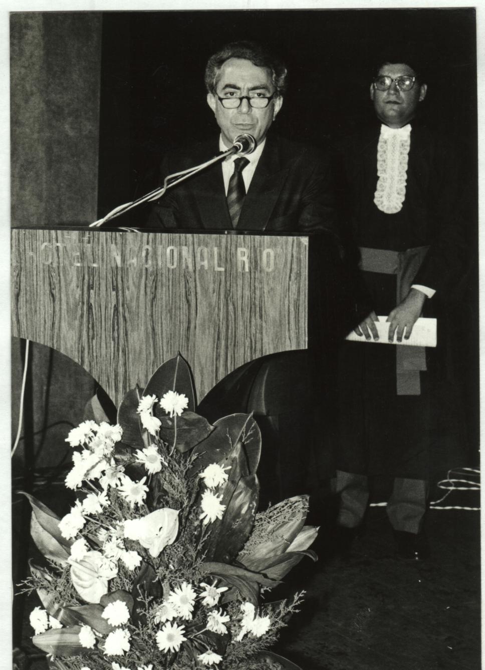 O então Ministro de Estado das Relações Exteriores do Brasil, Francisco Rezek, participa do evento de formatura dos alunos do Departamento de Direito no Hotel Nacional.