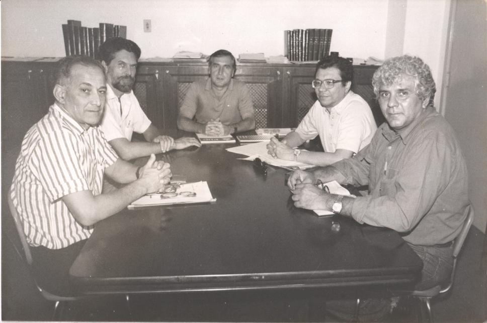 Da esq. a dir.: prof. Erasmo Ferreira (FIS), prof. Ênio Frota (FIS), Prof. Gilson Batista (FIS), Prof. Luiz Scavarda(FIS) e Prof. Carlos Viera (FIS).