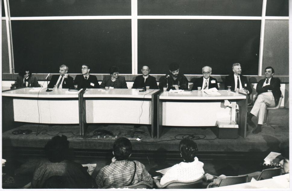 Professores de letras participam de debate no auditório relacionado ao X Encontro de Professores Universitários de Língua Inglesa (Enpuli), realizado entre 30/07 e 03/08/1990.