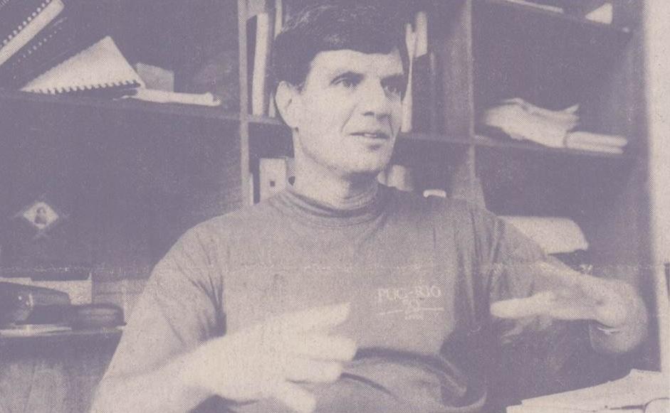 Professor Roberto Azevedo, então diretor do curso de Engenharia Civil, concede entrevista ao Jornal da PUC. Usa camiseta dos 50 anos da PUC-Rio.