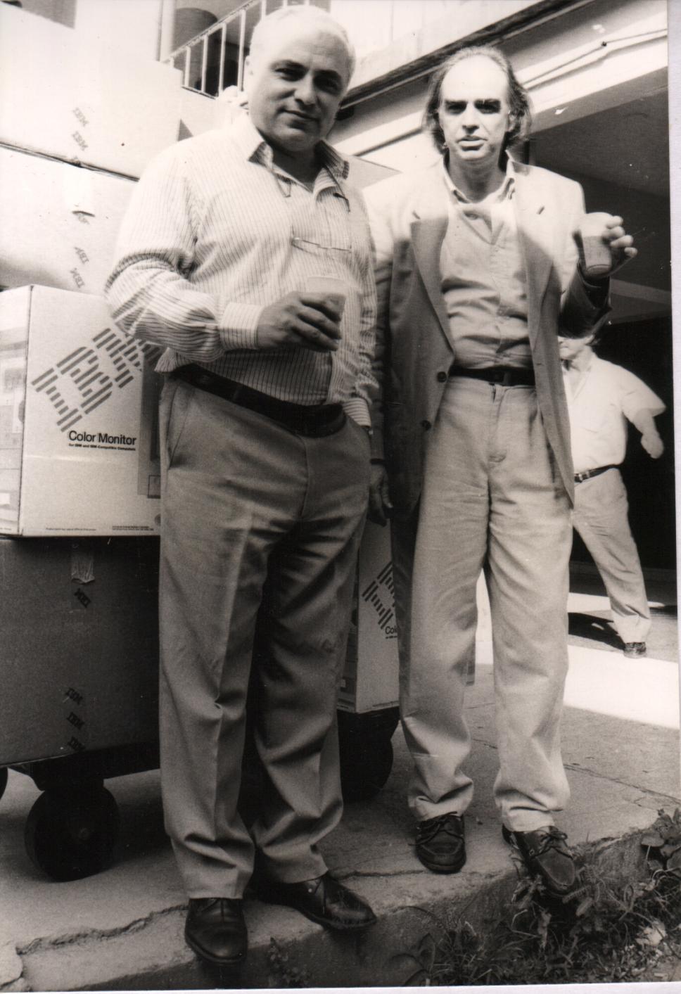 Chegada de 50 microcomputadores doados pela IBM, fruto de um Convênio entre a PUC-Rio e a empresa. Os computadores foram destinados ao Multilab (Laboratório Multimídia de Ensino de Ciências e Engenharia) e ao Departamento de Comunicação Social, sendo utilizados pelo Projeto Comunicar. Foto tirada na entrada do Bandejão pela Vila dos Diretórios.