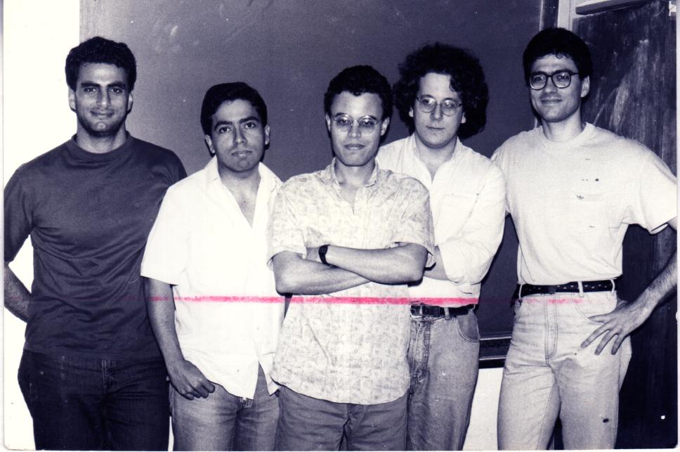 Cinco alunos de física posam para foto em sala de aula, em matéria publicada no Jornal da PUC referente à bolsa de estudos nos Estados Unidos pelo CNPq e Capes.