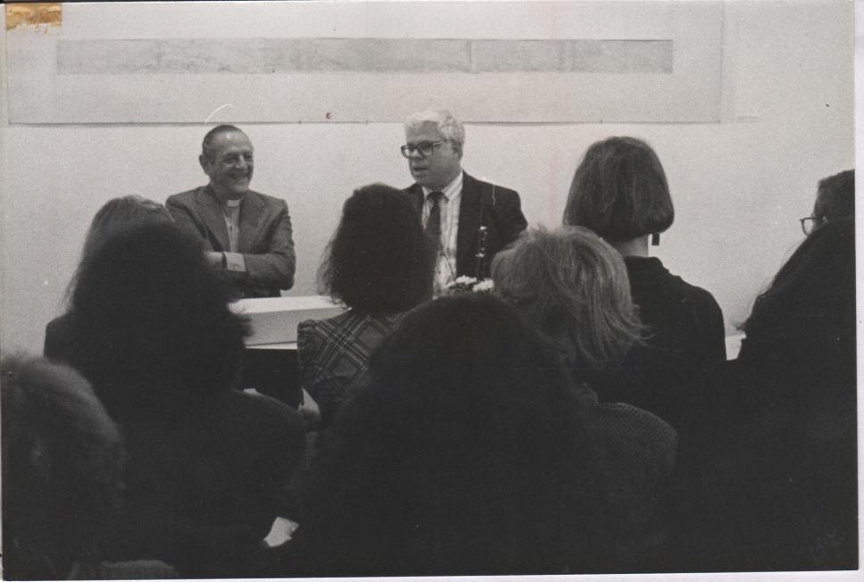 O Reitor da PUC-Rio, Pe. Laércio Dias de Moura S.J. ao lado de Sérgio Paulo Rouanet, Secretário Nacional de Cultura, em palestra sobre a Política Nacional de Cultura. O evento encerrava oficialmente a exposição A Morada Carioca, parte da programação da conferência Rio 92.