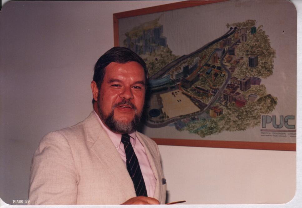 Professor Eurico Borba, Vice-reitor de Desenvolvimento, em frente a um mapa colorido do campus.