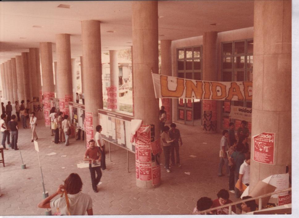Faixas e cartazes do movimento estudantil durante as eleições para o DCE. Chapa Unidade. Ao fundo, a casa atualmente ocupada por setores do Comunicar.
