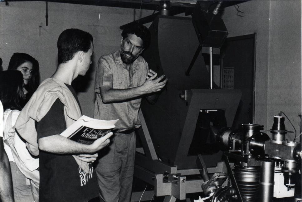 Professor Ênio Frota conversando com aluno ao lado do Acelerador Van de Graaff.