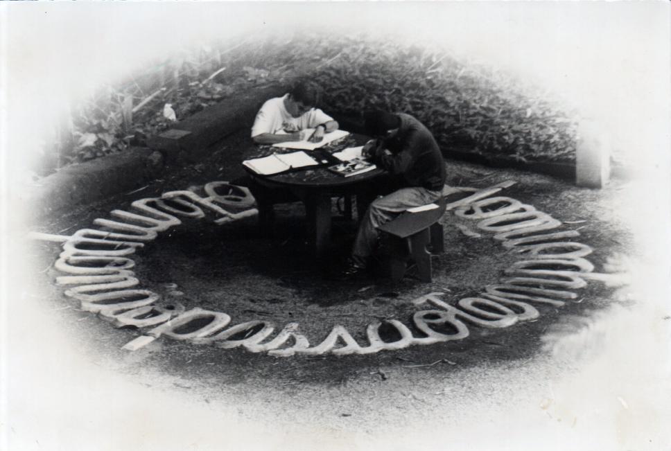 Alunos estudam onde estava exposta a obra, com os dizeres "...otemponãopassa...", da escultora Lia do Rio, como parte do Museu ao Ar Livre, da PUC-Rio.