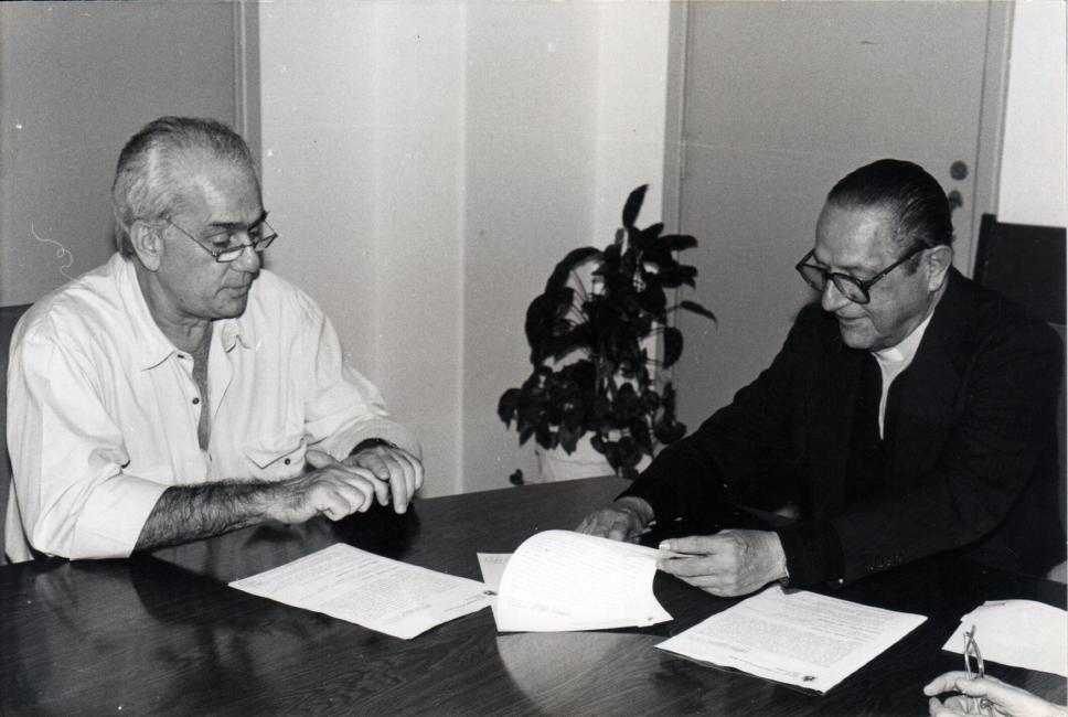 Lauro Monteiro Filho observa o Reitor pe. Laércio S.J. assinar convênio entre a PUC-Rio e a Abrapia (Associação Brasileira Multiprofissional de Proteção à Infância e Adolescência). O objetivo do convênio era prestar serviços de assistência social e jurídica na defesa de crianças e adolescentes vítimas de maus tratos.