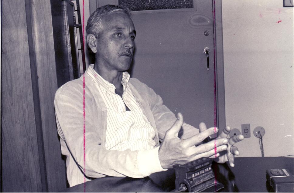 Professor José Carlos D'Abreu, à época diretor do DCMM, dando entrevista sobre a instalação de um moderno microscópio eletrônico alemão em seu Departamento.