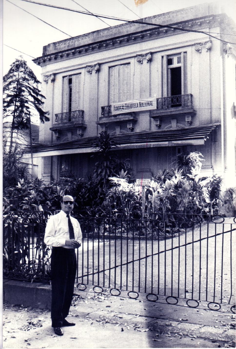 Professor Affonso Romano de Sant'anna, diretor da Biblioteca Nacional, pousa para foto em frente a casa cedida pela União à Instituição, no bairro das Laranjeiras. Nela, ele pretendia instalar a Fundação Nacional do Livro Infantil e Juvenil e também abrigar o centro de documentação e pesquisa do setor.