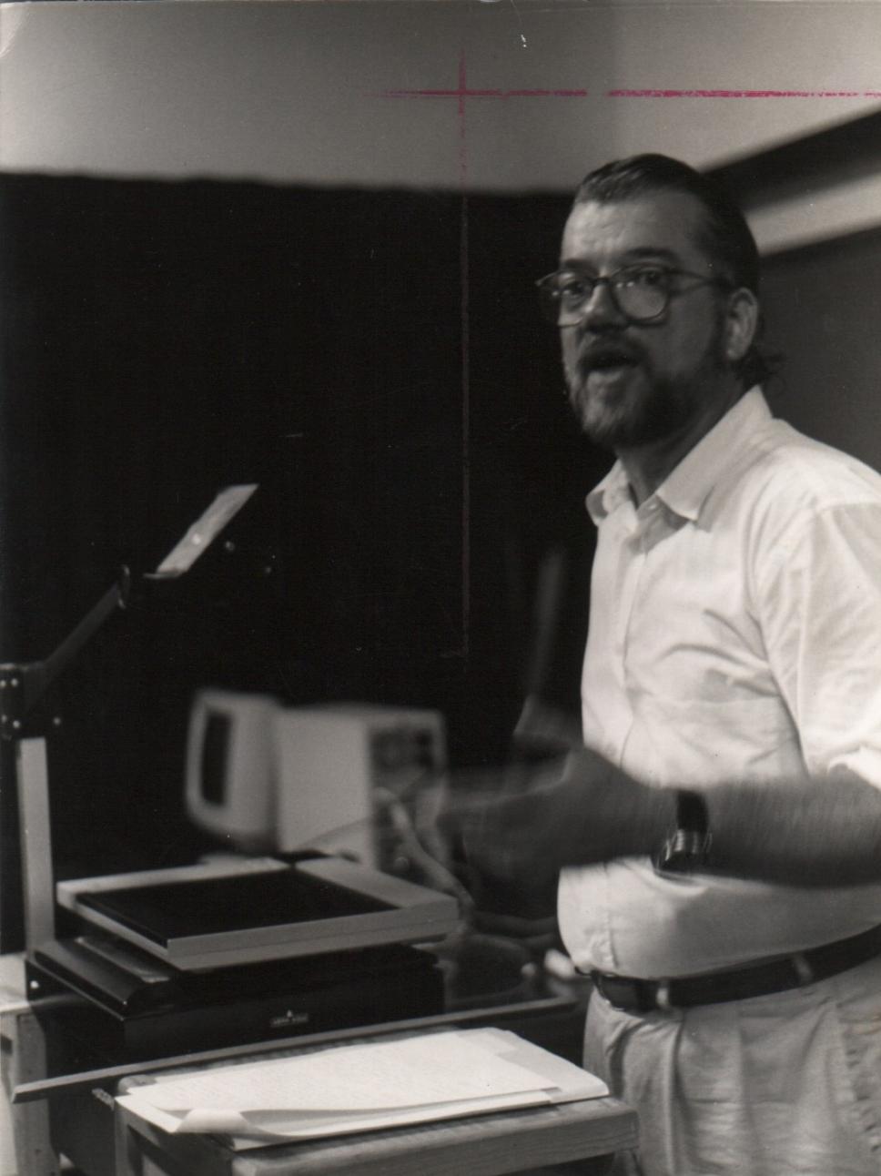 Foto do professor Carlos Chaves, publicada no Jornal da PUC, em matéria sobre o seu novo método de ensino que utilizava recursos de multimídia.