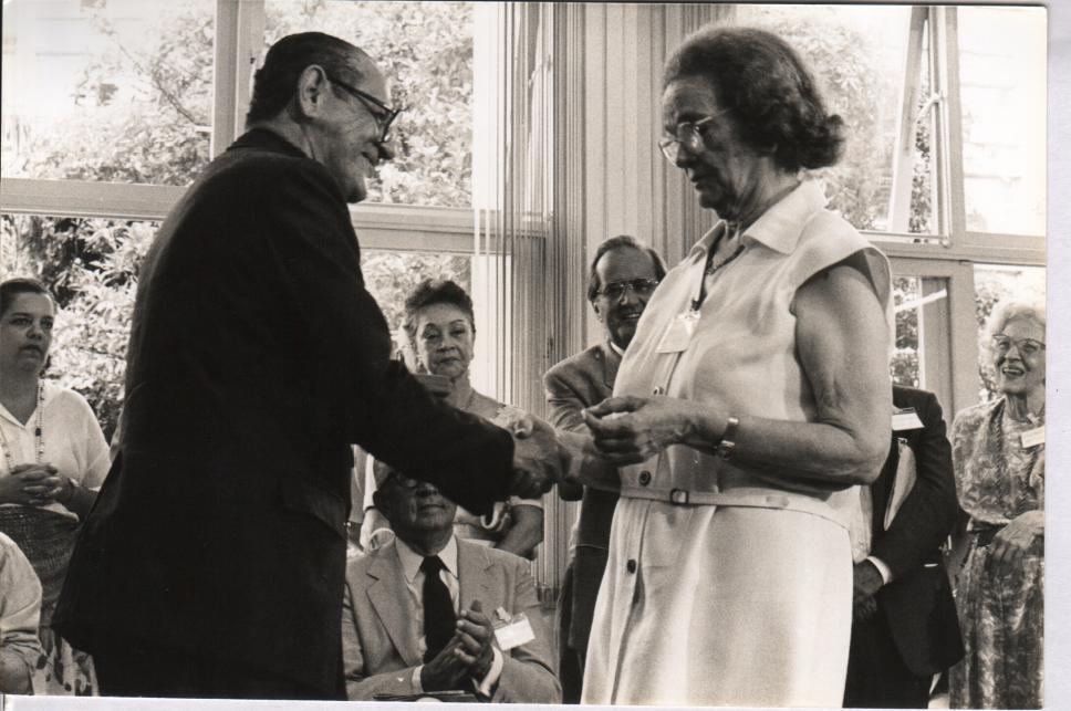O Reitor Pe. Laércio entrega medalha a uma das professoras homenageadas nos 50 anos da PUC-Rio.