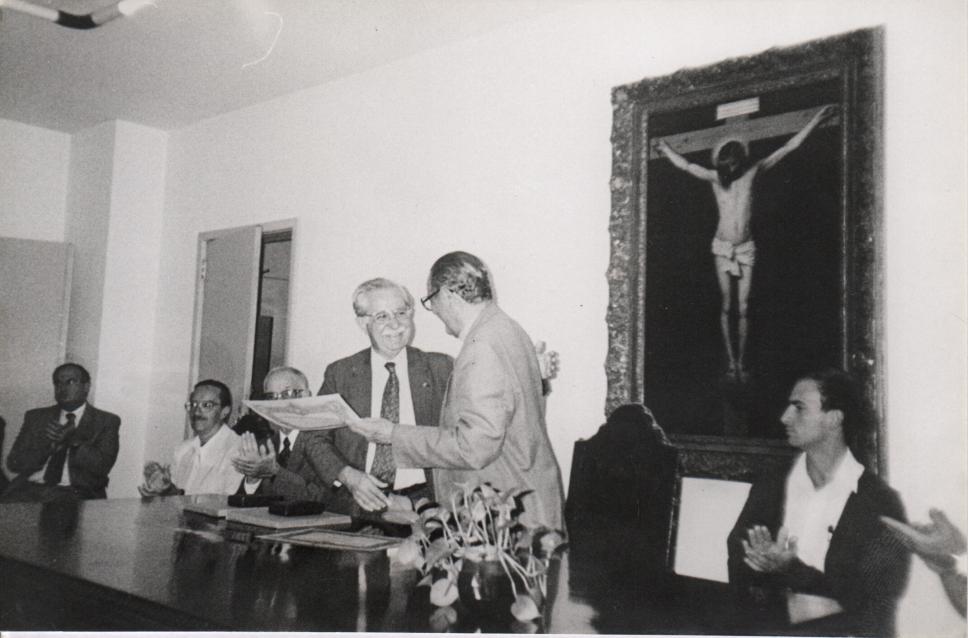 Reitor pe. Laércio Dias de Moura S.J. entrega ao professor Lindolpho de Carvalho Dias a Medalha do Mérito Cardeal Dom Sebastião Leme.