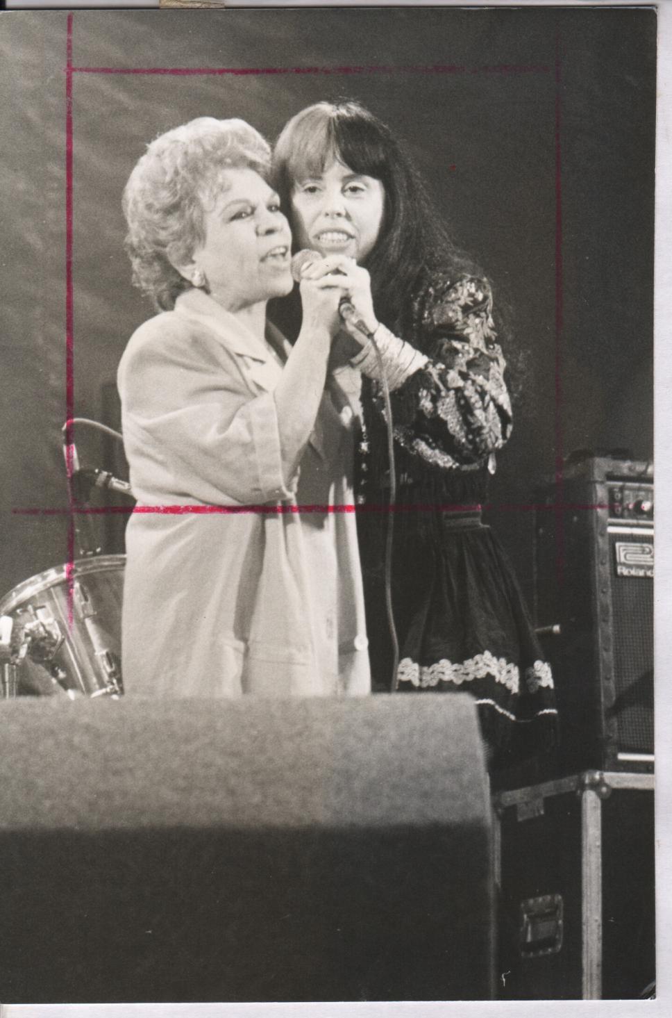 As cantoras Baby Consuelo e Ademilde Fonseca durante a apresentação musical.