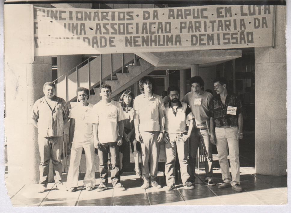 Funcionários da Associação de Alunos da PUC posam com faixa de protesto.
