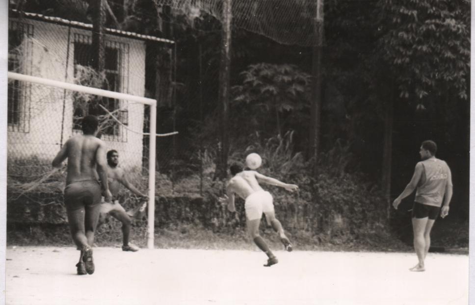 Funcionários participam de jogo de futebol.