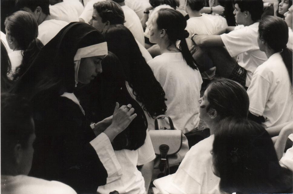 Alunos são pintados durante o trote do curso de Comunicação Social da PUC-Rio. O ano de 1995 foi marcado por novas propostas de brincadeiras, já que as antigas eram vistas como repetitivas e até mesmo agressivas.