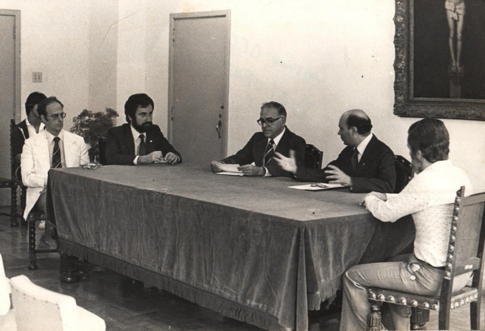 Na mesa da esq. para dir.: prof. Luiz Davidovich (FIS), n.i., n.i., pe. João Augusto Anchieta Amazonas Mac Dowell S.J. (Reitor), Prof. Carlos André Pereira Lucena (INF).