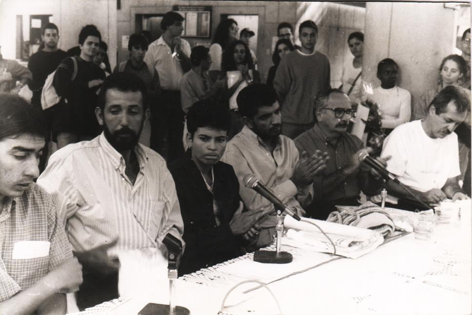 Na mesa da esq. p/ dir.: Fausto Trindade (DCE), José Rainha, Diolinda, Márcio Barreto, prof. Augusto Sampaio e pe. Ricardo Rezende.