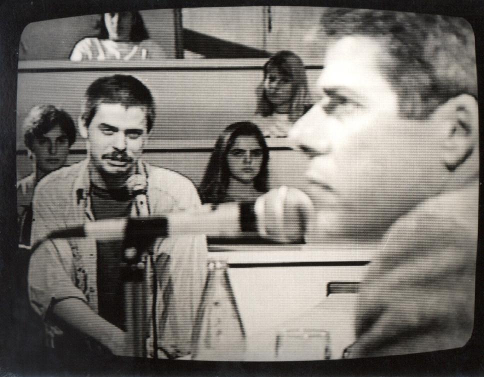 Frame de vídeo do curta de ficção "O Dia da Cura" (1994) que teve cenas gravadas no Auditório do RDC da PUC-Rio. Dirigido por Alfredo Alves, o curta sobre a AIDS foi produzido em parceria do Instituto Brasileiro de Análise Sócio-econômica (IBase) com a Associação Interdisciplinar da AIDS (Abia). Teve em seu elenco os atores Marcos Winter e José Mayer.