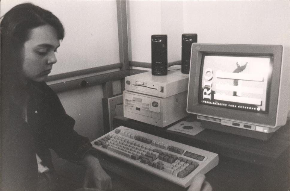 Aluna sentada em frente ao computador IBM.