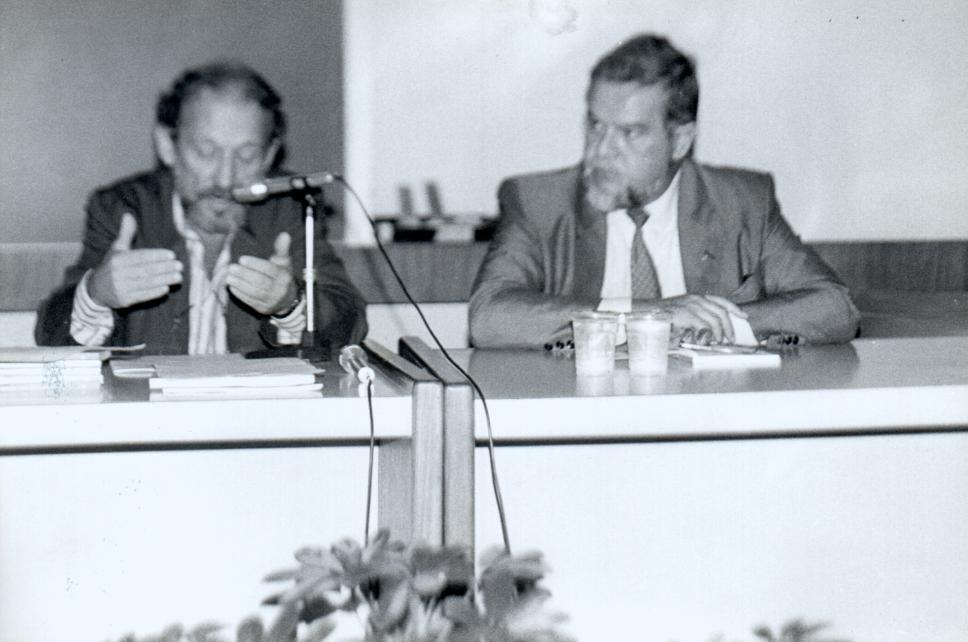 O prof. José Marcio ministra palestra na Semana de Meio Ambiente e Desenvolvimento. O evento foi dividido em dois seminários: o primeiro abordava as raízes teológicas e filosóficas do meio ambiente, enquanto o segundo debateu assuntos técnicos-científicos. A semana foi organizada pela PUC-Rio por conta da conferência ECO-92, que ocorreu em junho de 1992.