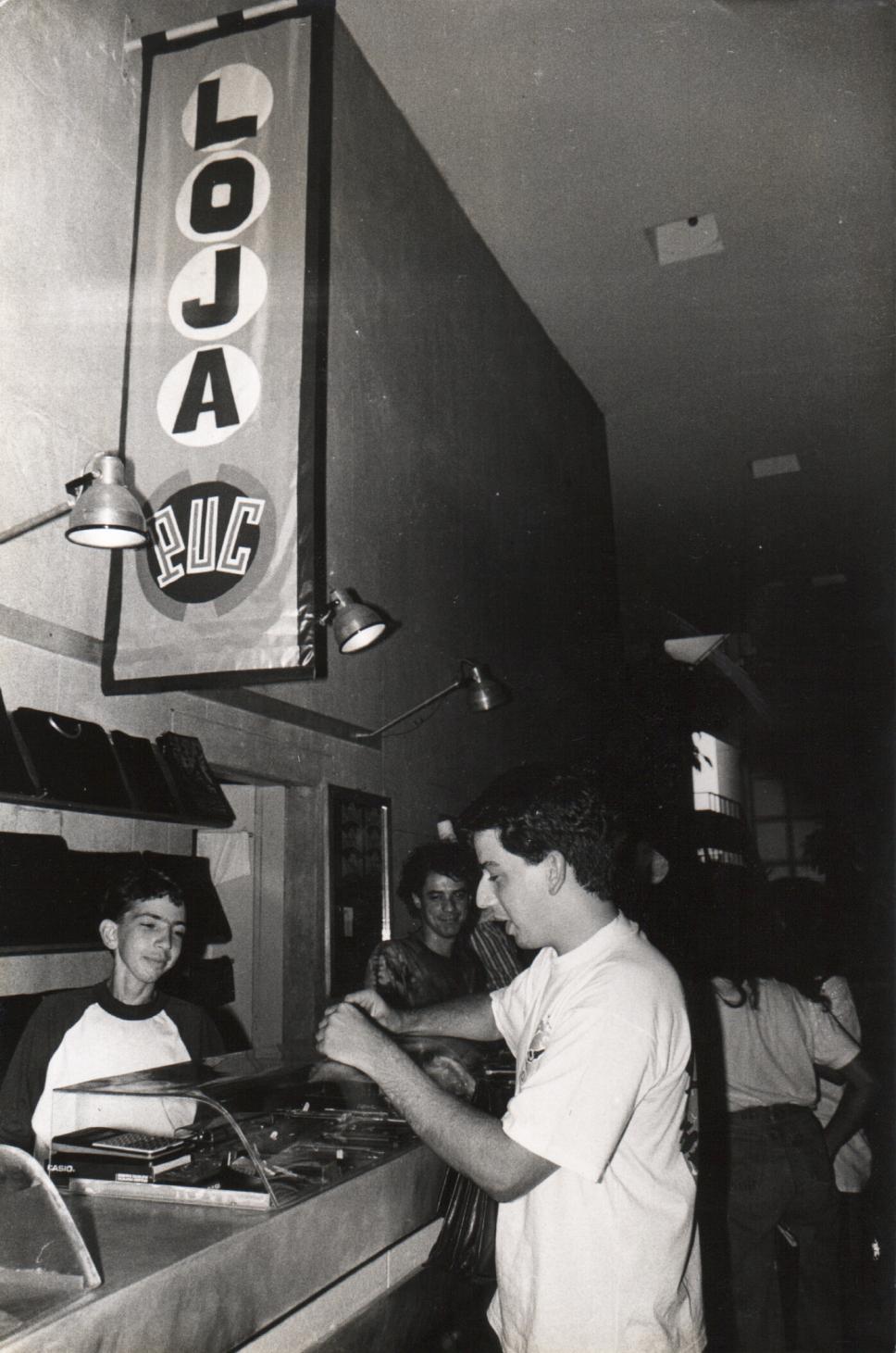 Alunos observam os produtos da Loja PUC que vendia camisas, lápis, cadernos e outros itens com a marca institucional da PUC-Rio.