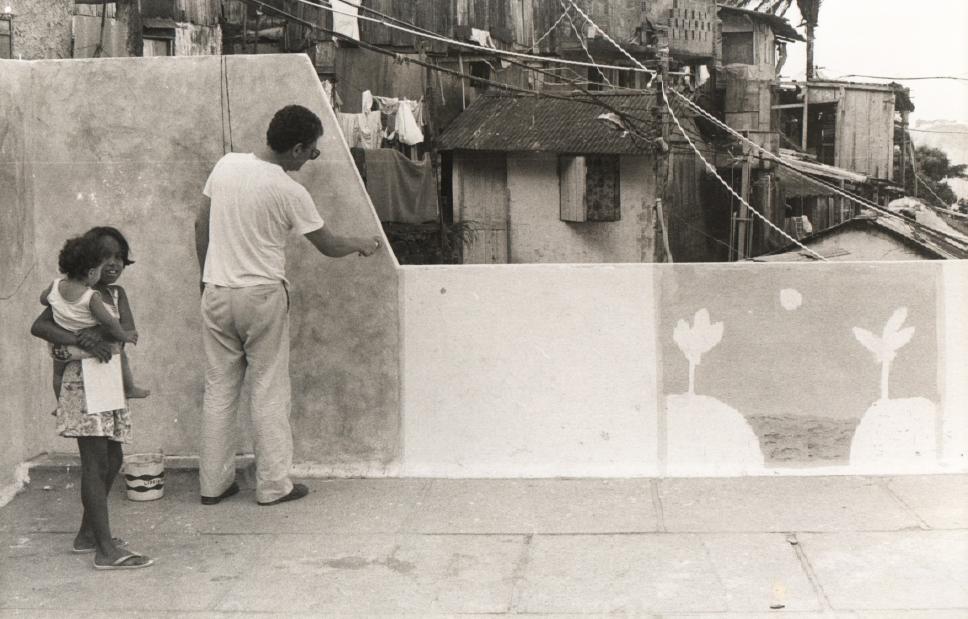 Mimo Roselli pinta um muro no Morro Santa Marta, em Botafogo, onde desenvolveu projeto com adolescentes da favela. O pintor teve obras expostas no Solar Grandjean de Montigny de 27 de junho a 27 de julho de 1991.