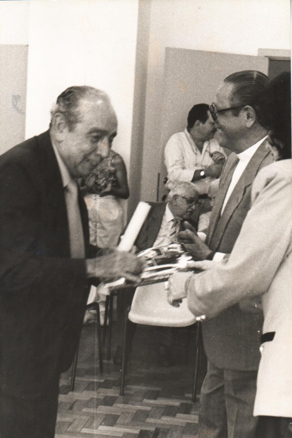 Professor Rinaldo Delamare, então Decano do Centro de Ciências Biológicas e de Medicina (CCBM), recebe o diploma de professor-fundador do reitor pe. Laércio S.J. A cerimônia homenageou professores que participaram da criação de cursos, unidades e órgãos na PUC-Rio. O prof. Rinaldo Delamare fundou o curso de Aperfeiçoamento Médico na Universidade em 1953.