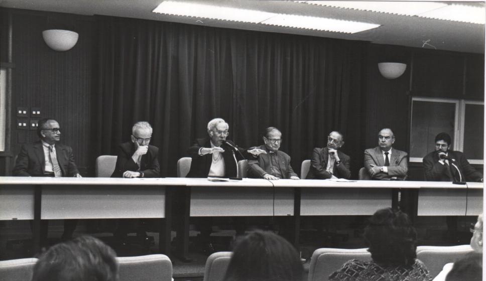 Da esquerda para a direita Prof. Augusto Sampaio, Padre Magalhães Guimarães Ferreira, Dom Luciano Mendes de Almeida, prof. pe. Jesús Hortal Sànchez S.J. (TEO), Padre Laércio Dias de Moura, Nelson Janot Marinho e Silva Mello