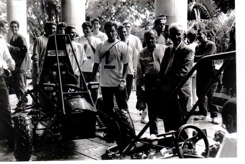 Professores Augusto Sampaio e pe. Pedro Magalhães Guimarães Ferreira S.J. visitam os protótipos de automóveis em miniaturas com simulador de movimento, projeto coordenado pelo prof. Mauro Speranza Neto do Curso de Engenharia de Controle e Automação.