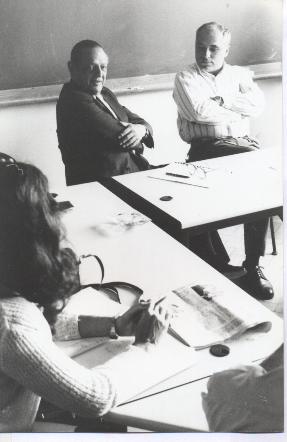 O prof. José Antonio Pimenta Bueno em reunião com o reitor Pe. Laércio S.J. sobre a iniciativa do Departamento de Engenhara Industrial e do Banco Nacional para desenvolvimento de um projeto de cálculo para tentar reduzir a quantidade de dinheiro que fica armazenada nas agências no período da noite.