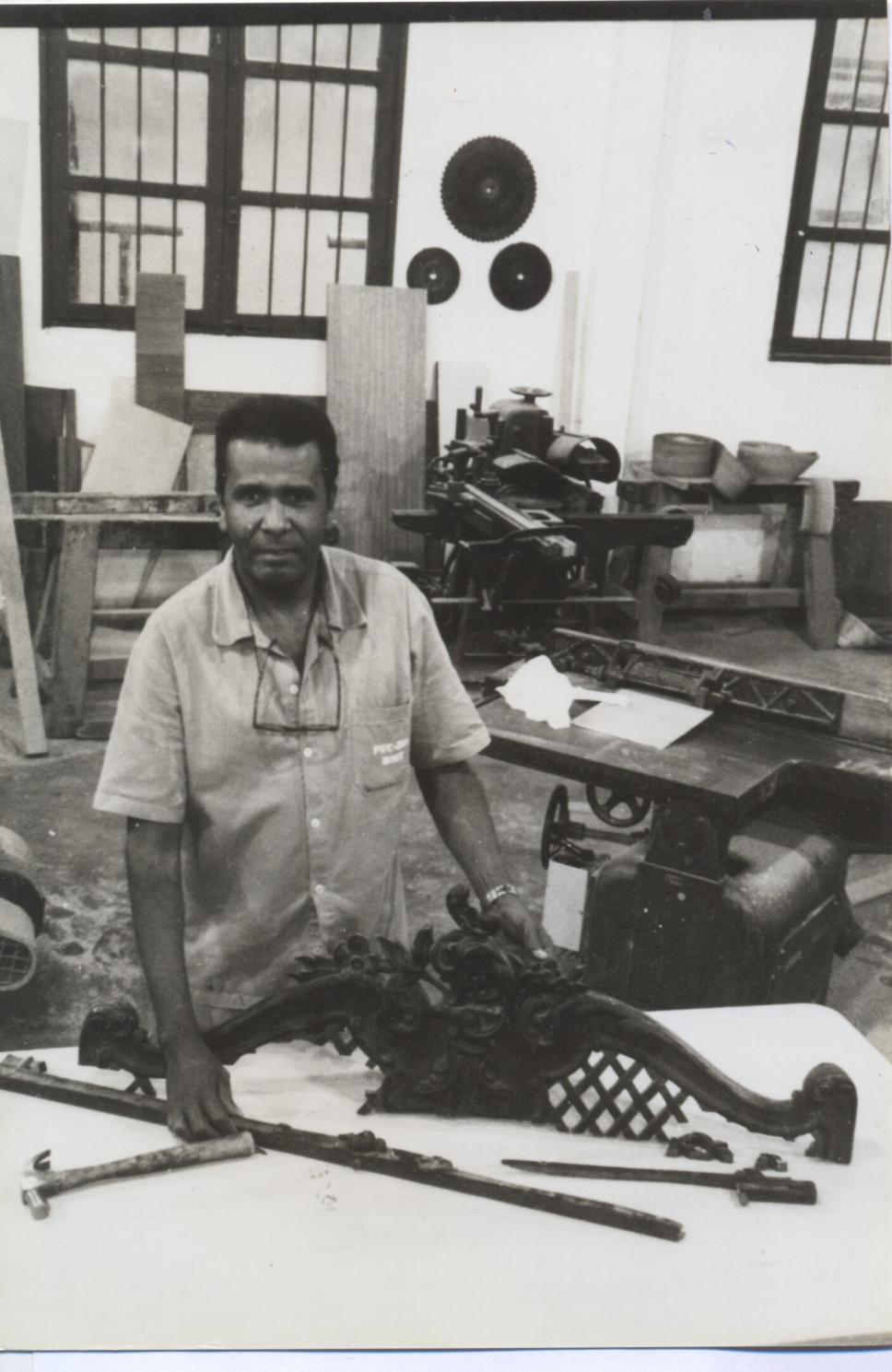 O funcionário da carpintaria, Nelson Elias, restaura um fragmento de vitrine projetado pelo desenhista italiano Antonio Borsoi. A peça faz parte do acervo do Solar Grandjean de Montigny.