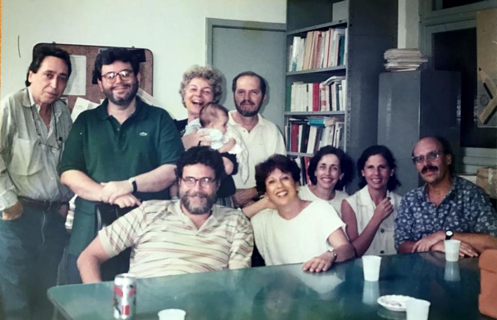 Sala Dep.História. De pé: César Guimarães, Ricardo Benzaquen, Margarida Neves com Alice no colo (filha de Beatriz Catão e Bernardo Ferreira), Ilmar Mattos. Sentados: Marcelo Jasmin, Berenice Cavalcante, Selma Rinaldi, Flávia Eyler e Antônio Edmilson. 1994