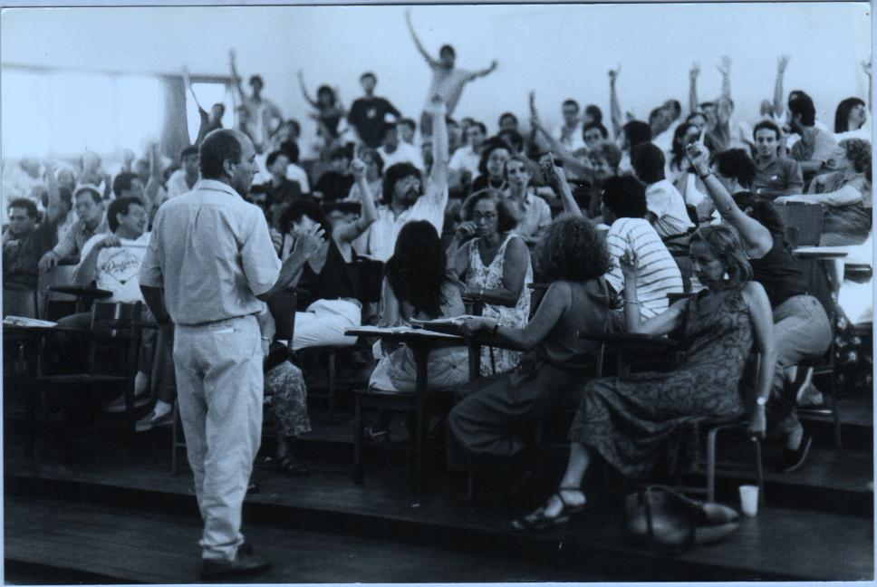 Assembleia de professores. Momento de uma votação.