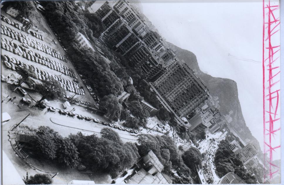 Imagem do alto, provavelmente a partir do Ed. Cardeal Leme, de parte do estacionamento principal, da Av. Pe. Leonel Franca, do Planetário e da Auto-estrada Lagoa-Barra. Fila de carros para entrar no estacionamento. Ainda não havia os pontos finais de ônibus.