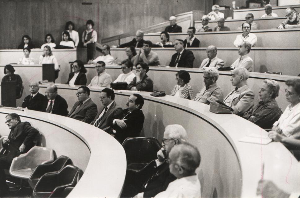 Professores e membros do Conselho de Desenvolvimento assistem apresentação do padre Peter-Hans Kolvenbach, prepósito geral da Companhia de Jesus, sobre a missão da universidade católica e sua relação com o mundo.