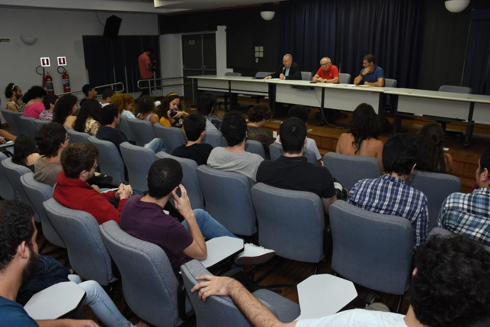 Mesa com autoridades e plateia com integrantes das chapas eleitas para os CAs e o DCE.