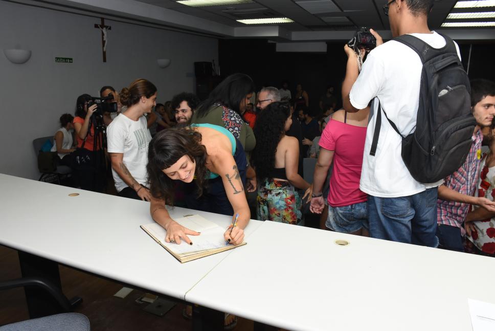 Integrantes das chapas eleitas para os CAs e o DCE assinam o termo de posse.