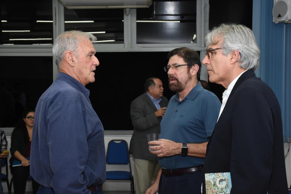 Os professores conversam com o Vice-reitor para Assuntos Acadêmicos, prof. José Ricardo Bergmann após o lançamento.
