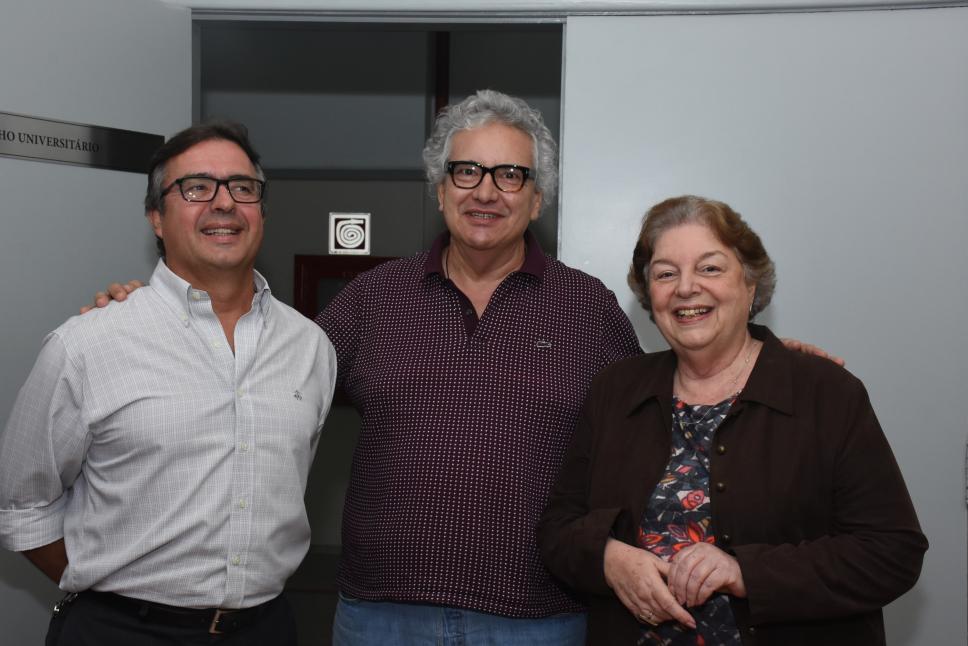 Da esq. a dir.: 2º prof. Sérgio de Almeida Bruni (Vice-Reitor para Assuntos de Desenvolvimento), 3º profa. Margarida de Souza Neves (Núcleo de Memória).